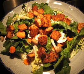 This is a salad with seared marinated tempeh. Flatly, it is my favorite way to eat tempeh. Yes, tempeh bacon is wonderful and makes excellent sandwiches. I like tempeh BLTs, but I really like my salad.