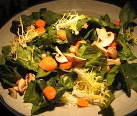 While things are searing, wash and chop your salad vegetables. I used spinach and frisee for the greens, plus chopped baby carrots, mushrooms, and a tiny bit of green onion. I think this combination works well, especially when you combine sweet carrots with bitter inner leaves of frisee. Almost anything you want in a salad should be fine, though. Radishes, for instance: ++. If you want a particularly springy salad, do radishes, chopped snow peas, lots of sprouts and sunflower seeds. If you want a fally salad, roast some squash or beets and pumpkin seeds and add those. Whatever you have will work.