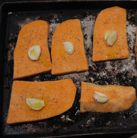 Peel a sweet potato or two roughly equal in volume to your beans. I had a gargantuan potato, so I only used half of it. Cut your potato into big slices about half an inch thick, then toss to coat in some olive oil. Spread the slices on a baking sheet in one layer, season with salt, pepper, and cayenne, and stick a crushed clove of garlic on each slice. Roast them at 350F for about a half hour, or until they're golden brown around the edges and soft in the middle.