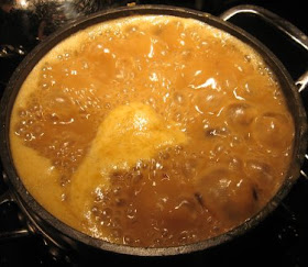 When the onion business is soft and translucent, tip in the sweet potato and a bay leaf or two. Then fill the pot about halfway with water. HALFWAY. We were using a 3 quart pan, and managed to get the water level within an inch of the top. Go us! The subsequent boil and simmer were eventful.