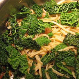 Drain your pasta. I used linguine, since we had linguine, but something like rotelle would also be good. Chunky pastas serve the same purpose as the savoy leaves: they're ridgy and bumpy and let tasty bits cling easily. The linguine worked out fine, though.