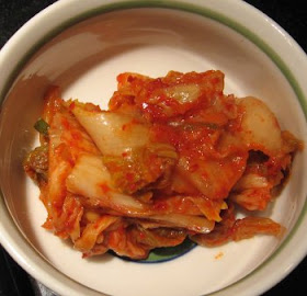 Peel and mince several cloves of garlic and a shallot; soften them slowly in olive oil. Season with a little cayenne and a little more red pepper flakes, plus maybe a little oregano for greenness. While the garlic and shallot are cooking, wash, devein, and chop several leaves of cabbage. I used three leaves for just me.