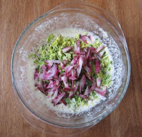 Finely chop your vegetables of choice. The great thing about these pancakes is that they can take practically anything you throw at them. I used one green onion, 3 or 4 small cabbage leaves, and 1/2 a huge radish. You want all the vegetables to be in fine, thin strips.