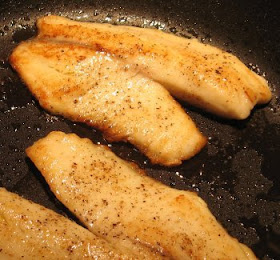 Heat a frying pan big enough to hold your filets on medium-hot. We had tilapia, but practically any white fish should be fine here. Add a slug of olive oil and tilt the pan to spread it around. Salt and pepper both sides of your fish, then lay them gently in the pan. They'll sizzle a lot.