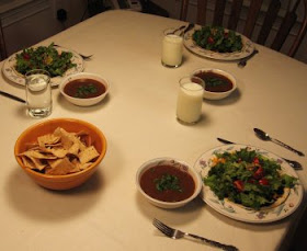 For the most part, though, it went over well. It seemed like the biggest change for my parents was serving size. We're used to eating one huge plate of one thing; they're used to eating a plate of several smaller things. They're used to eating meat at every meal, such that they have to eat less to get full, and they drink milk, which is a lot more filling than our normal water. We also do a lot more exercise, and are used to coming home actively hungry. I was trying to accommodate their normal idea of multiple-item dinner, to make the construction familiar, but wasn't thinking about serving amounts very much. So the full bowl of soup plus 1-layer tostada was too much for them, while John and I both ate everything.