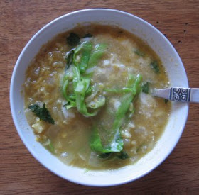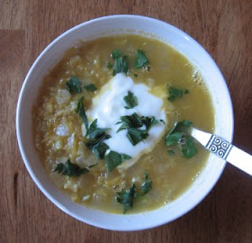 Chop and sauté onions with oil and curry spices of choice; add red lentil, rice or potato, lots of broth; simmer. Salt.