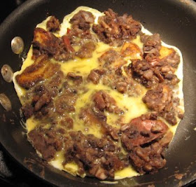When your leftovers are warm through, turn the heat to medium-low. Beat an egg or two in a measuring cup, add some salt and pepper, and pour the egg evenly over the pan. Tilt to get egg as many places as possible. Grind some more pepper on the surface, or maybe add some paprika or parsley if you want. Pull any set edges away from the sides of the pan, letting uncooked egg run underneath. Give it maybe three or four minutes to cook.