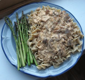 Now eat it! Egg noodles, big spoonfuls of stroganoff, lots of snipped parsley if you have it. I didn't have any, but that was fine.