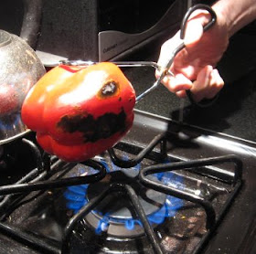 To roast: grip pepper firmly in heatproof tongs. Hold it over the open flame of the gas burner, turning to get all sides evenly blistered. You want about 70% of the skin to blacken, peel, and crackle. Be careful, since the skin will start to loosen and slip as the pepper roasts. You may need to set it down and regrip it a couple times.