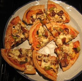 Lay out your pitas on a baking sheet. Smear them lightly with olive oil, then add tomato sauce, a little salt, and anything you like on pizza. I made a really traditional pizza, with lots of chopped mushrooms, green pepper, thin shallot slices, and mozzarella. I also cut my seitan slices into little squares before adding them. Finish the pizza with appropriate herbs: basil and oregano in my case.