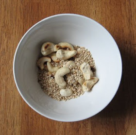 Add your toasted nuts and a few squirts of sriracha, mix everything together, and eat from a nice hand-sized bowl.