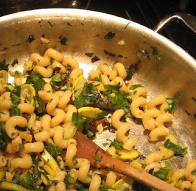When the squash are cooked through and everything tastes good, turn off the heat. Add your drained pasta and most of your shredded basil to the veg; stir to distribute things evenly and wilt the basil.