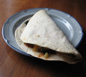 Now fold the tortilla over and toast until slightly golden brown. Either use a frying pan, flipping halfway through, or use the toaster oven. You don't want to turn on the real oven at a time like this.