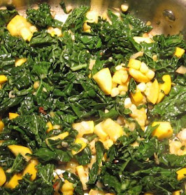 Husk a couple ears of corn and saw them gently off the cobs. Try not to get either cornsilk or kernels all over your kitchen. Don't try this next to a hot burner. Trim and dice a squash or two; wash, stem and chop a couple big handfuls of greens. I think we used an entire small bunch of kale, which worked very well here; kale is awesome. Oh, you didn't think kale liked this kind of thing, did you? IT DOES. Other vegetables you could use: bell pepper, jalapeno, maybe some precooked potato or sweet potato?