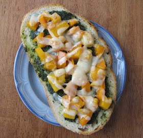 Spread pesto on a slice of sourdough or other good bread. Add a layer of chopped tomatoes (or leave plain), then cover with grated parmesan or romano cheese. Toast in the toaster oven until the cheese is melted and beginning to turn golden. Eat it and feel satisfied with your life.