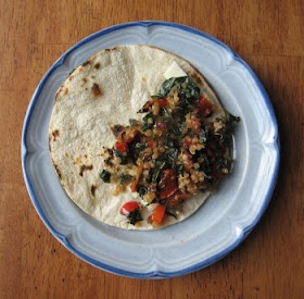 For the filling, chop up half a red onion/some other onion and a clove or two of garlic and soften them in olive oil. Add some minced jalapeño and some chopped red pepper, some cumin and a little pinch of oregano. When everything is soft and delicious together, throw in a handful of cooked quinoa, a big handful of shredded kale, a pinch of salt, and a splash of water. Then cover it and let it steam until the quinoa is hot through and the kale is wilted and tender, maybe 3 minutes.