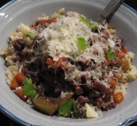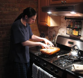 Let those cook together for a minute or two while you prep tomatoes. I used a combination of canned tomato puree and maybe four or five of my frozen-from-summer tomatoes, which worked fine. I think I'd cut up some canned whole tomatoes if I didn't have any frozen ones, but just using puree or whatever you have on hand should be fine. In summer you of course should use all the real tomatoes in the land. So. Chop any solid tomatoes into reasonable pieces and throw them into the pan.