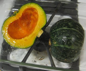Preheat oven to 350F or thereabouts. Chop your kabocha in half and scrape out all the seeds and guts; you can roast the seeds separately if you so desire. Brush the cut squash halves with olive oil, and sprinkle them with salt and pepper.