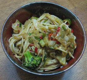 Cut up a stalk of broccoli, separating florets into smaller pieces, and peeling and dicing any edible stem. When the onion and pepper mixture is fully soft and fragrant, add the broccoli to the pan, along with a generous spoonful of peanut butter, a sprinkling of soy sauce, and a spoonful of sambal oelek or other hot pepper jam. As well, give the business a thorough grinding of lots of fresh black pepper. Mix this all together and let it cook.