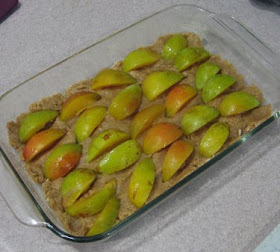 Now it is time to cut up plums. Halve and pit them; if they're big, cut them further into quarters or sixths. Press the plums, cut side down, into the batter, covering as much of the cake surface as possible. Sprinkle the whole business with some sugar, lemon juice, and cinnamon, and stick it in the oven.