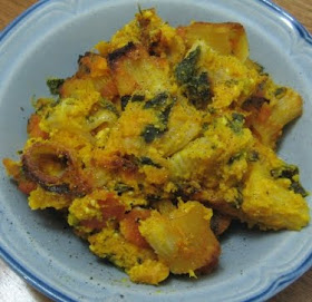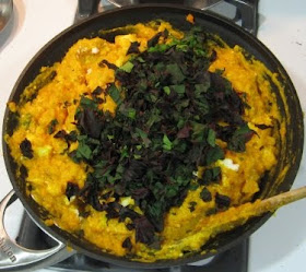 Is your squash cool enough to handle? Ok. Scoop it out of the skin and add it to your pan of onion and garlic. Since I was using kabocha squash, which has a very thin skin, I had a pretty hard time doing this. Mostly the squash ripped under its own weight. That's ok, though; kabocha skin is edible (although other winter squash skins are not), so if you want, you can mash it right in. Hooray!