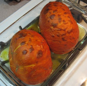 First, get a kabocha squash or another winter squash of your choosing. Chop it in half. Scoop out and discard the seeds (or obsess about whether to keep them for spring sowing even though you only have a couple of inadequate window boxes on the balcony), and brush the cut surfaces with olive oil. Put the squash halves cut side down in a baking pan of some type with a little water, and roast at 350F for about an hour.