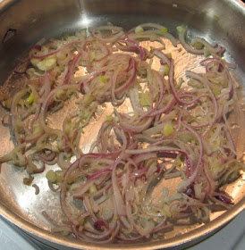 While my pasta water was coming to a boil, I slowly melted a bunch of thinly sliced red onion in a mixture of olive oil and butter. I'm pretty sure I just used red onion by itself, but a mix with chopped shallots would definitely be good.