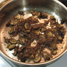 When the onion was largely softened and definitely fragrant, I added a couple big handfuls of sliced mushrooms. After some salt and pepper, I left the business to caramelize over medium-low heat, stirring occasionally.
